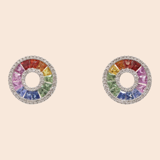 These earrings feature a stunning ombré transition, meticulously curated from 26 multi-colored sapphires totaling 2.111 ct. The gradient flows through a spectrum of oceanic blues, sun-drenched yellows, forest greens, and cherry-blossom pinks. This vivid display is...Regular price $2,850.00