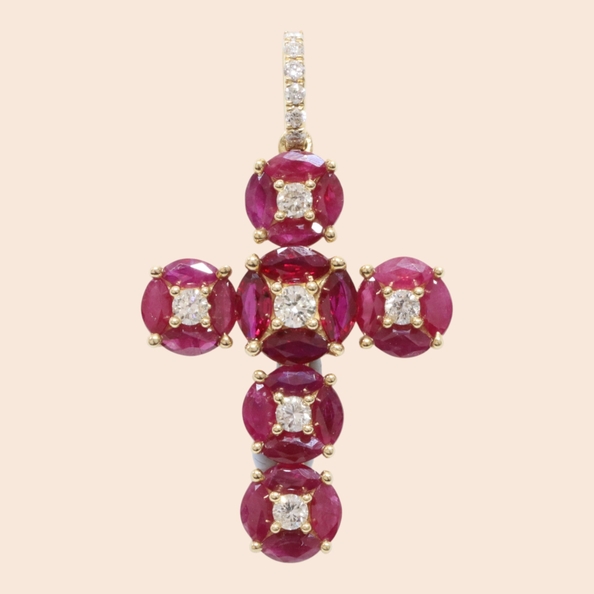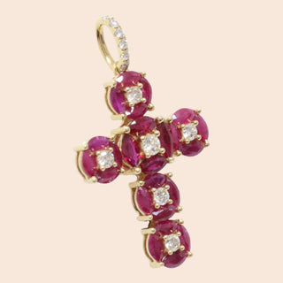 - 'Makoto' Ruby and Diamond Cross Pendant with 18K Yellow Gold