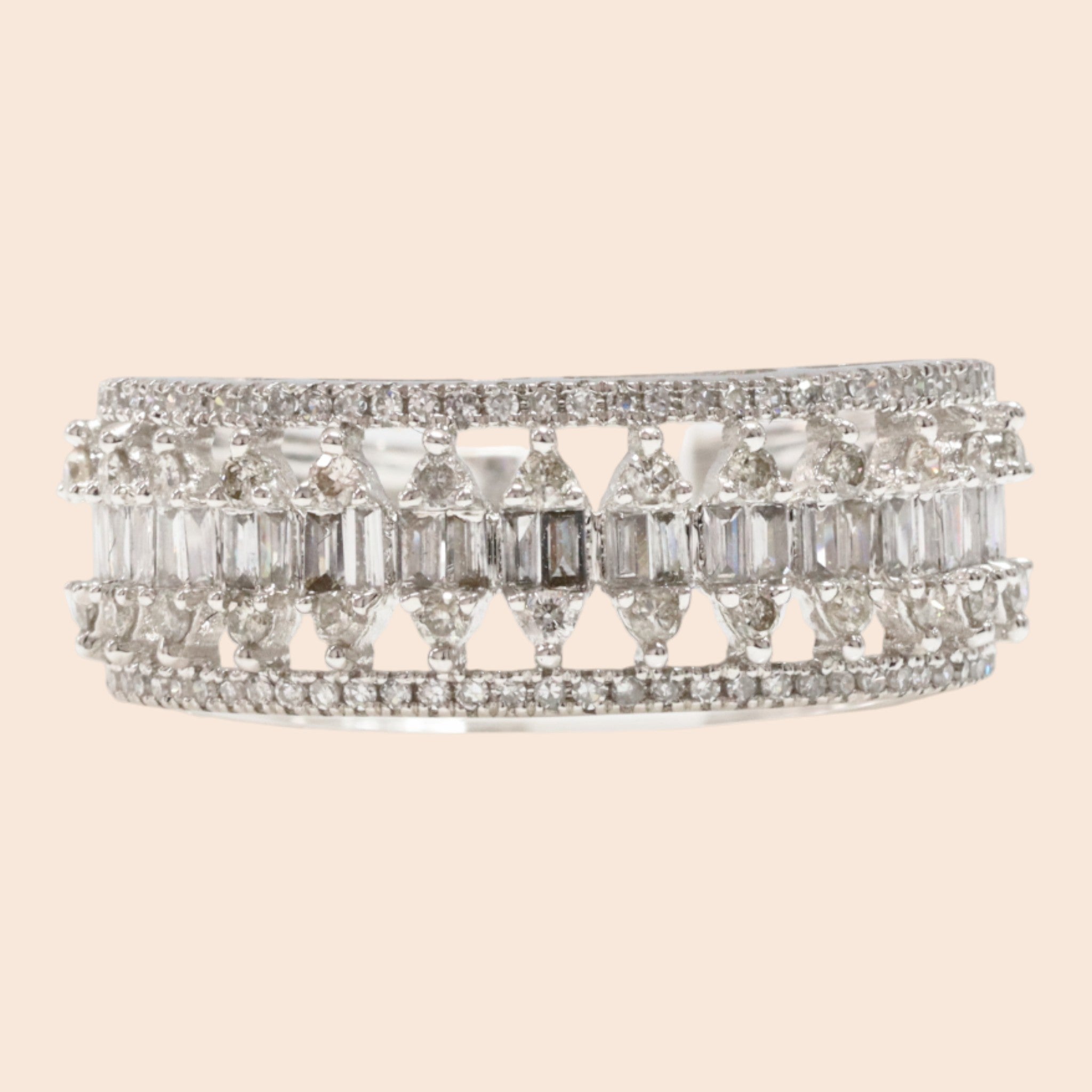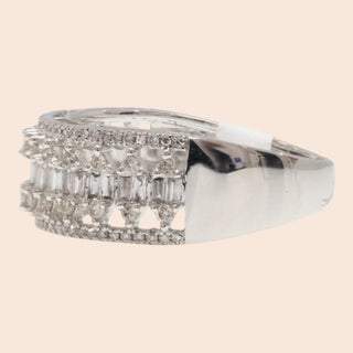 Bridging the gap between classic and contemporary. The 'Hikari-No-Hashi' ring features radiant 0.30ct of Natural Brilliant Cut Diamonds diamonds, flanked by 0.19ct of tapered baguettes that create a seamless bridge of light toward the 18K White Gold band. The result is a silhouette that feels expansive and airy, a sophisticated take on the traditional diamond ring.