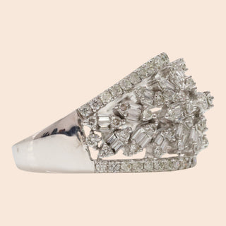 A crown for the everyday. The 'Kammuri' ring is a majestic tribute to the modern woman. Featuring 1.19ct of earth-mined diamonds arranged in a regal tiara silhouette, this 18K white gold piece sits proudly on the finger. It is a symbol of self-sovereignty and timeless grace—a masterpiece of natural brilliance that commands any room.
