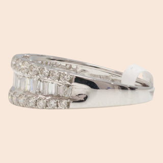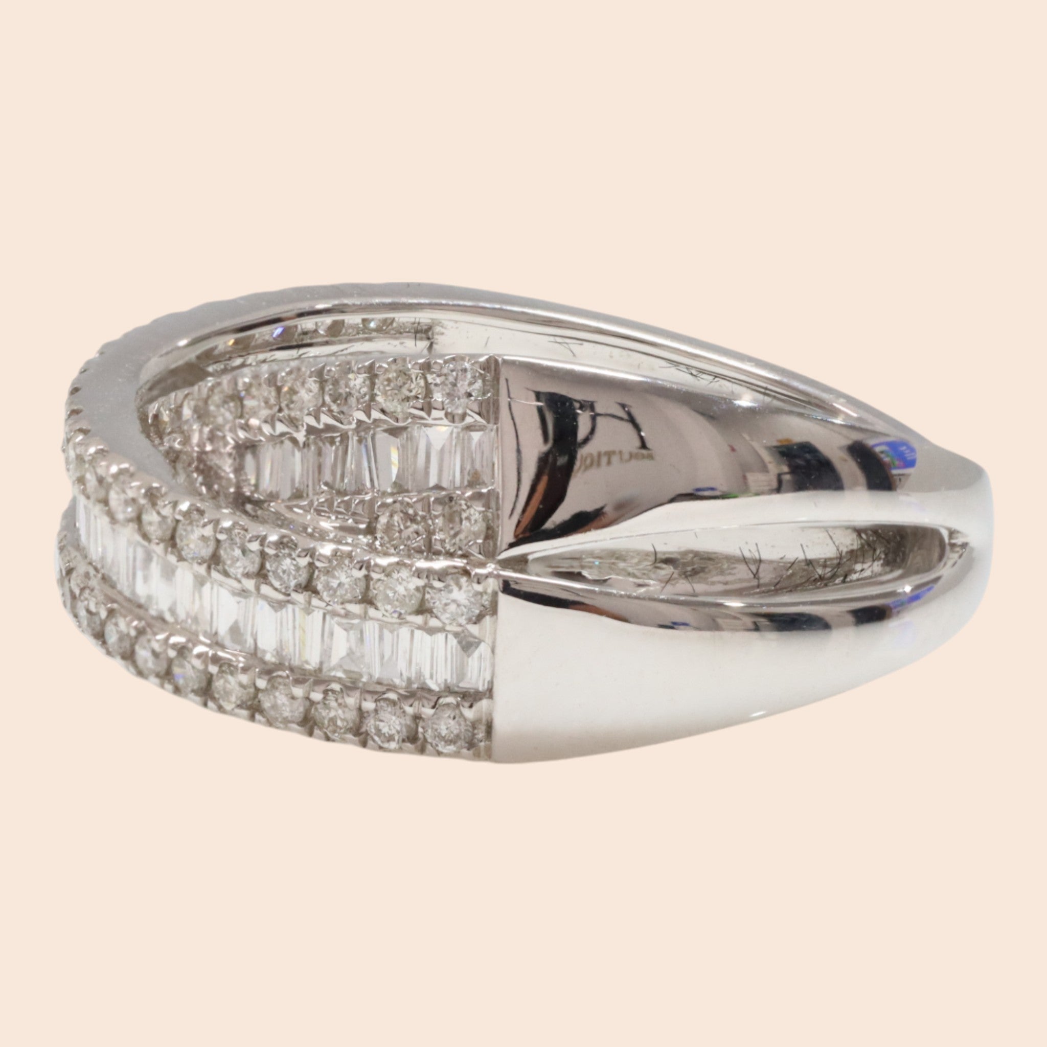 Dimensions of brilliance. The 'Kasane' ring is a masterclass in layered luxury. With 0.92ct of diamonds set in 18K white gold, it features a central core of crystalline baguettes flanked by two shimmering borders of round brilliants. It is a substantial, wide-profile piece that offers a multi-dimensional sparkle from every angle.